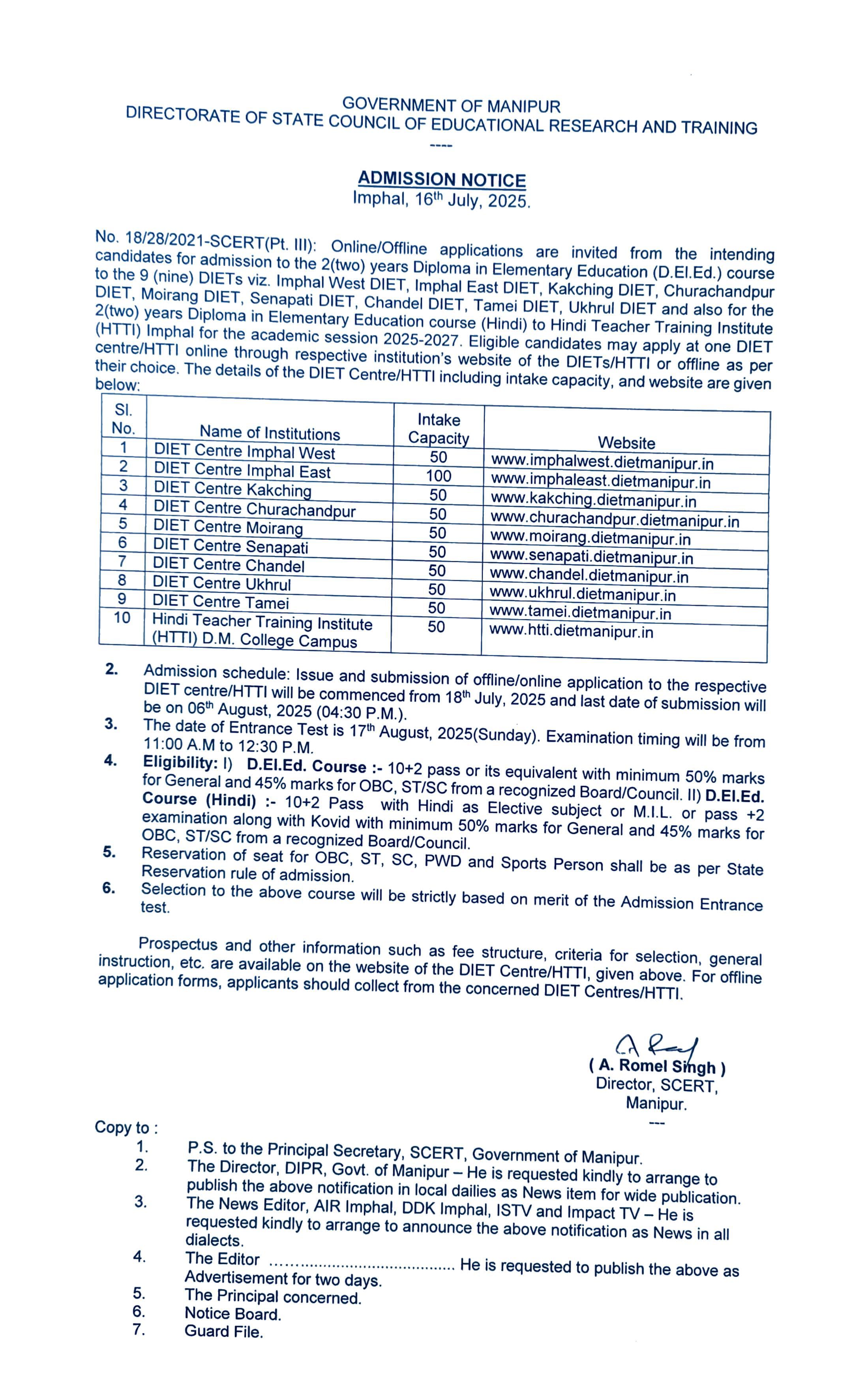 Entrance Examination Center: Candidates may select the DIET Institute as Entrance Examination Center at the DIET Institute where he/she had applied. If he/she doesn’t want to select the DIET Institute where he/she has applied for admission as the Entrance Examination Center, Candidates applied at DIET Chandel/Churachandpur/ Senapati/ Tamei/ Ukhrul can select DIET, Imphal West Center. Again, Candidates applied admission at DIET Imphal-east/ Imphal West/ Kakching/ Moirang can select entrance exam Center at DIET Churachandpur Center.